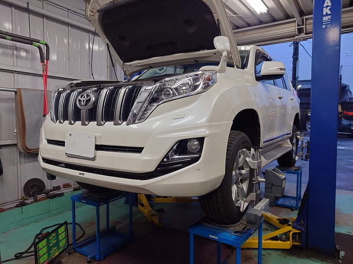 トヨタの150系ランドクルーザープラドが、リフトアップキットと調整式ラテラルロッドの持ち込み取り付けとアライメント調整の施行で入庫しました!
