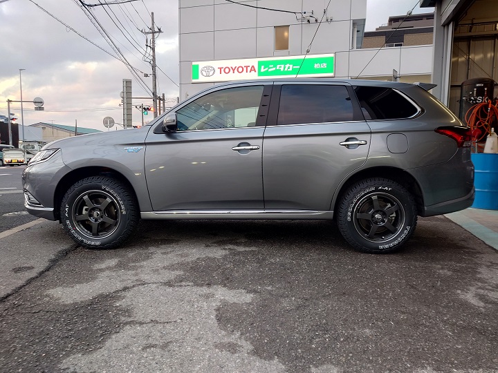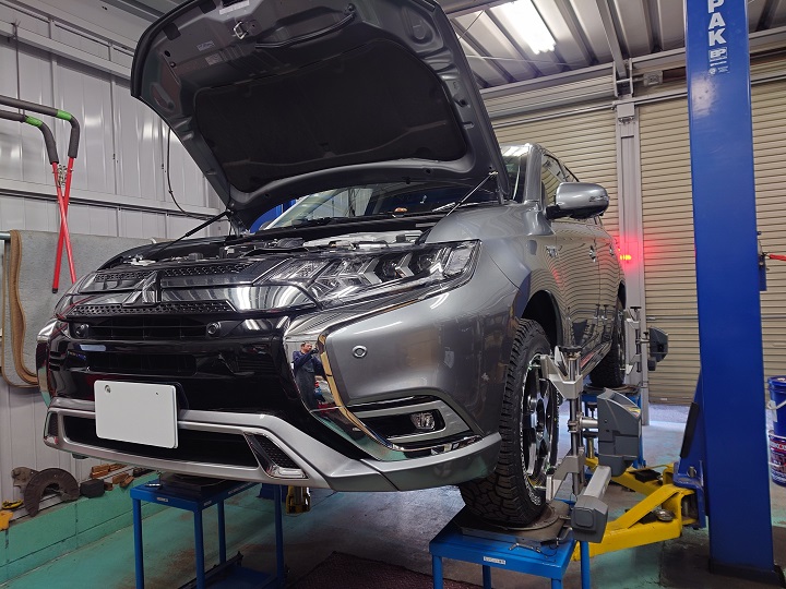 三菱のアウトランダーPHEVが、リフトアップスプリングとショックの持ち込み取り付けとアライメント調整の施工で入庫しました!
